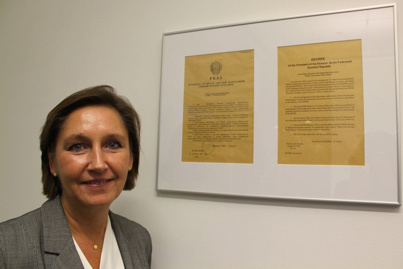 „Hér er leyfið sem Boris Jeltzin veitti Radio Svoboda til útsendinga í Rússlandi. Hann gerði sér grein fyrir mikilvægi stöðvarinnar árið 1991 þegar fyrrverandi ofurstar gerðu tilraun til valdaráns og Radio Liberty var eina stöðin sem flutti fréttir.“