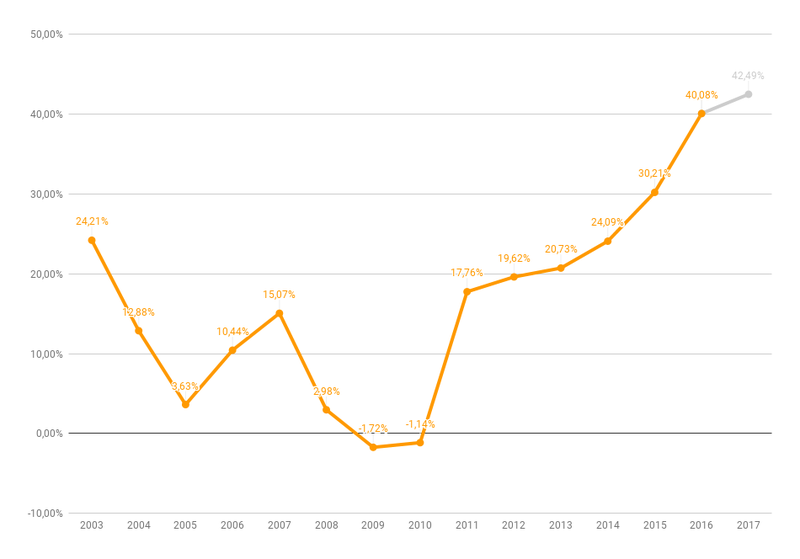 Aukning ferðamanna á milli ára síðan 2003 og áætlun fyrir árið 2017