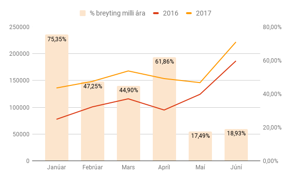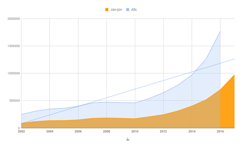 Ef hlutfallslegur fjöldi ferðamanna á fyrri og seinni helmingi ársins 2016 verður sá sami í ár má gera ráð fyrir að 2,5 milljónir ferðamanna heimsæki landið í ár. Miðað við það, þá eykst fjöldi ferðamanna enn um 42 prósent á milli áranna 2016 og 2017.