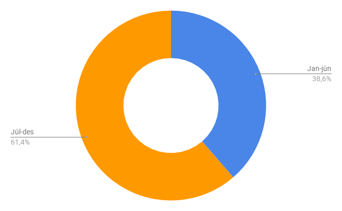 Undanfarin 15 ár hafa fleiri ferðamenn heimsótt Ísland á seinni helmingi ársins, þe. í júlí og fram að áramótum. Árin 2002 til 2016 voru að jafnaði 38,7 prósent heimsókna til landsins á fyrstu sex mánuðum ársins. 61,3 prósent heimsóttu landið á seinni sex mánuðum ársins að jafnaði.