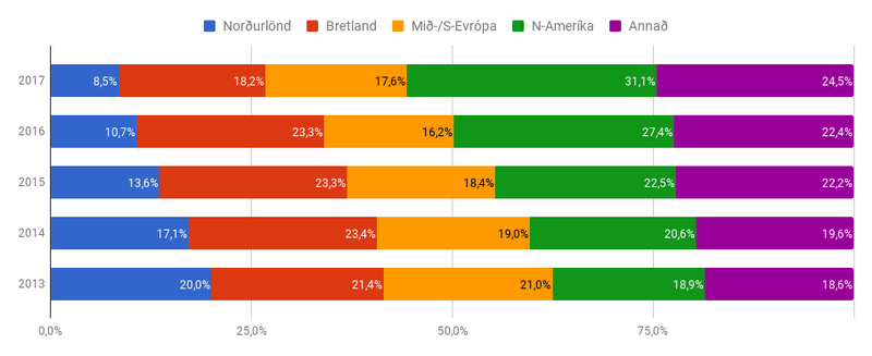 Samsetning ferðamanna á fyrri helmingi áranna 2013-2017 hefur þess vegna breyst töluvert. Árið 2013 var fimmtungur ferðamanna sem hingað komu á fyrri helmingi ársins frá Norðurlöndum, um það bil fimmtungur kom frá Bretlandi, fimmtungur frá Mið- og Suður-Evrópu, fimmtungur frá Norður-Ameríku og restin annars staðar frá.