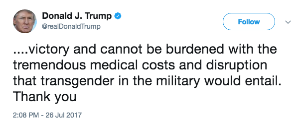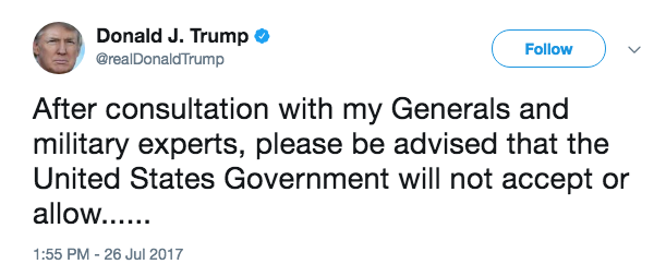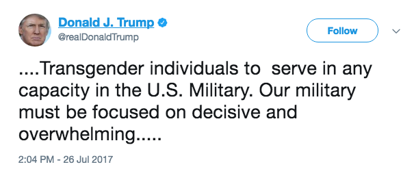 Trump skrifaði tvær færslur (sjá hér og hér: „Eftir að hafa ráðfært mig við herforingja og hernaðarsérfræðinga, er ég ánægður með að fá þau tilmæli að bandaríska ríkisstjórnin muni ekki taka við umsóknum eða leyfa ... transfólki að gegna herþjónustu í einhverju hlutverki í bandaríska hernum.“