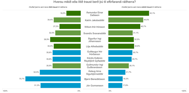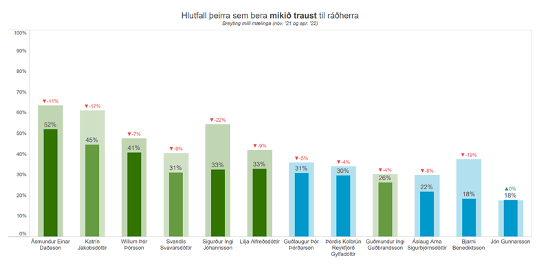 Er Maskína spurði þessarar sömu spurningar skömmu eftir að ný ríkisstjórn tók við keflinu undir lok síðasta árs voru þeir ráðherrar sem nutu mikils trausts yfir helmings svarenda þrír talsins, en bæði Katrín Jakobsdóttir forsætisráðherra og Sigurður Ingi Jóhannsson innviðaráðherra hafa fallið úr þeim flokki.
