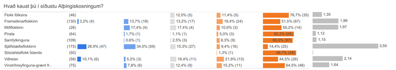 Bæði er hægt að glöggva sig á afstöðu svarenda eftir því hvernig þeir segjast ætla sér að kjósa til Alþingis ef kosið væri dag og einnig eftir því hvernig þeir segjast hafa kosið til Alþingis síðasta haust.