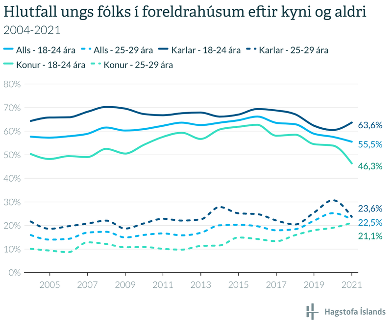 Samkvæmt tölum Hagstofunnar hafa orðið nokkuð miklar breytingar á högum ungra kvenna á aldrinum 18-29 ár utan höfuðborgarsvæðisins á skömmum tíma, en árið 2019 bjuggu 42,5 prósent þeirra með foreldrum sínum. Hlutfallið var orðið 24,9 prósent árið 2021, sem áður segir.