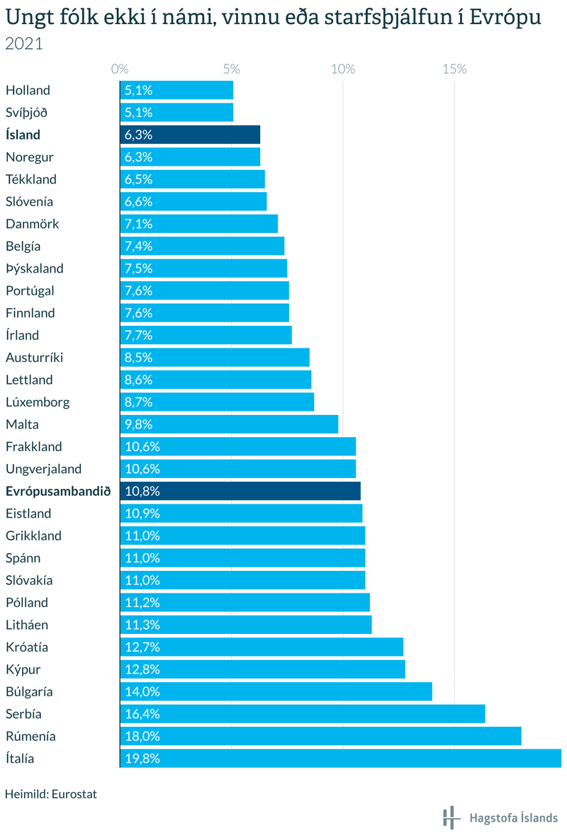 Í samantekt Hagstofunnar eru einnig tölur um hlutfall fólks á aldrinum 16-24 ára sem ekki er í námi, vinnu eða starfsþjálfun. Árið 2021 átti það við um 6,3 prósent Íslendinga á þessum aldri, og lækkaði hlutfallið úr 7,2 prósentum árið 2020.