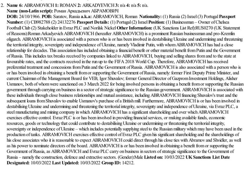 Í skjali sem bresk yfirvöld birtu í morgun er fjallað um ástæðurnar fyrir því að Abramovich og sex rússneskir auðmenn til viðbótar sæta nú refsiaðgerðum. Í tilfelli Abramovich virðist ástæðan fyrir refsiaðgerðunum einna helst vera eignarhald hans á stálframleiðandanum Evraz, þar sem hann fer með ráðandi hlut.