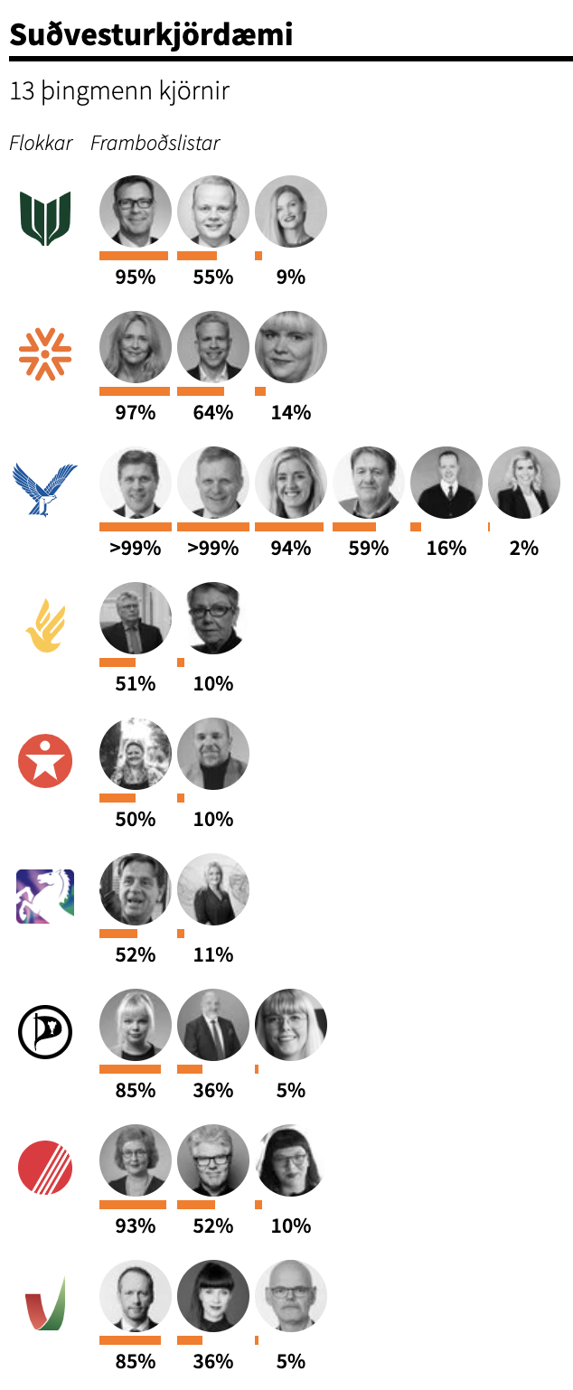 Samfylkingin, Miðflokkurinn og Viðreisn missa einn þingmann í kjördæminu samkvæmt þessum fyrstu tölum. Það myndi þýða að hvorki Samfylkingin né Miðflokkurinn fengju þingmenn, en oddvitar þessara flokka höfðu 93 og 52 prósent líkur á þingsæti samkvæmt þingsætaspánni.