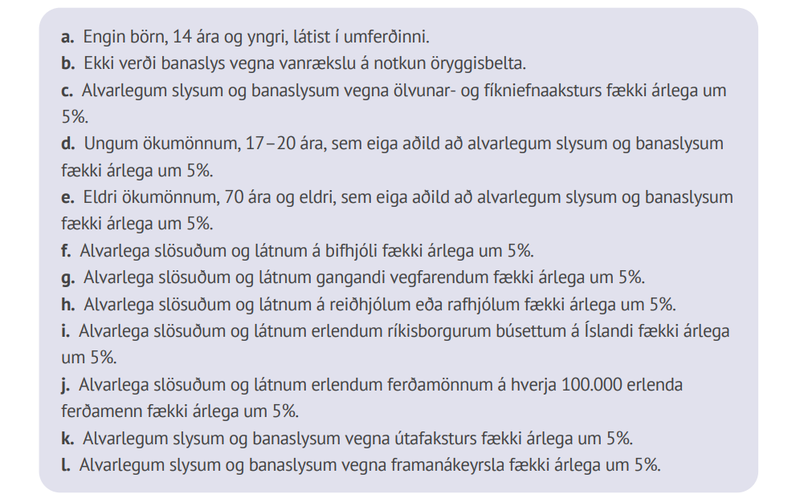 Nýja áætlunin er samkvæmt drögunum, sem hafa verið birt í samráðsgátt stjórnvalda, að mestu eins og sú sem nú þegar er í gildi. Þó bætist við eitt nýtt yfirmarkmið um að slysakostnaður á hvern ekinn kílómetra lækki að jafnaði um 5 prósent á ári til ársins 2037.