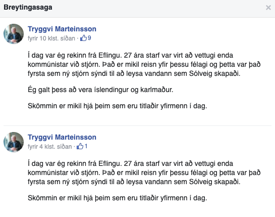 Tryggvi Marteinsson, kjarafulltrúi hjá Eflingu, var rekinn úr starfi í gær eftir 27 ára starf. Hann greinir frá því í stöðuuppfærslu á Facebook. Þar segir hann að starf hans haf verið „virt að vettugi enda kommúnistar við stjórn. Það er mikil reisn yfir þessu félagi og þetta var það fyrsta sem ný stjórn sýndi til að leysa vandann sem Sólveig skapaði. Skömmin er mikil hjá þeim sem eru titlaðir yfirmenn í dag.“