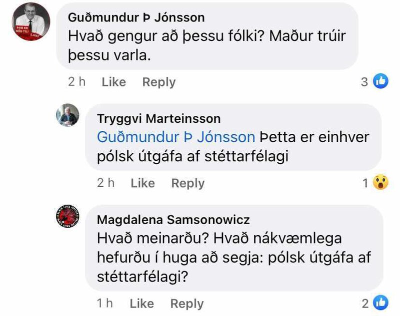 Í ummælum við stöðuuppfærsluna Tryggva lýsa ýmsir yfir óánægju með ákvörðun Eflingar. Á einum stað spurði maður hvað „gengi að þessu fólki“. Tryggvi svaraði: „þetta er einhver pólsk útgáfa af stéttarfélagi“. Hann eyddi síðar þeim ummælum en skjáskot af þeim má sjá hér að neðan.