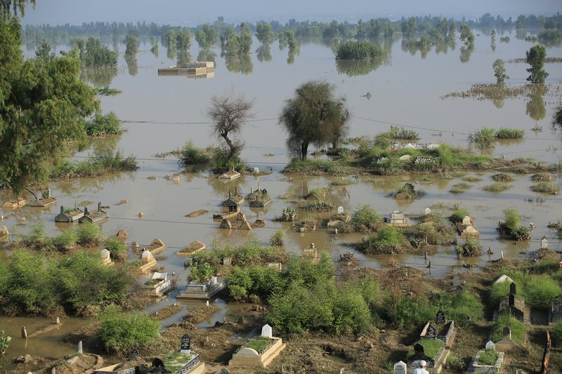 Hinar árstíðarbundnu monsún-rigningar hafa verið sögulega miklar. Úrkoman hefur mælst 190 prósent meiri en í meðalári síðustu þriggja áratuga. Og úrkomunni er misskipt eftir landshlutum. Í Sindh-héraði hefur úrkoman verið 466 prósent meiri en í meðalári.