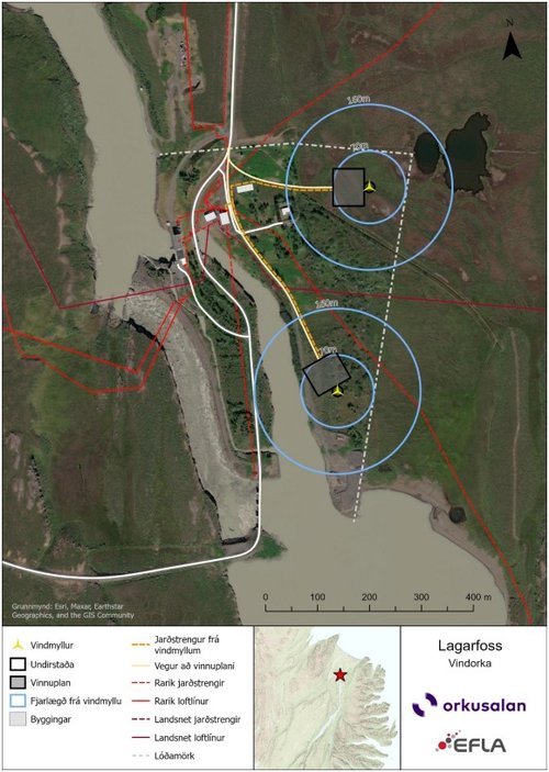 Myllurnar yrðu reistar á athafnasvæði Orkusölunnar við Lagarfossvirkjun í Lagarfljóti í um 2-300 metra fjarlægð austan við Lagarfossveg. Undirstöður mastranna yrðu líklega steyptar og allt að 25 metrar í þvermál. Vinnuplan við hvora vindmyllu yrði allt að 3.500 fermetrar.