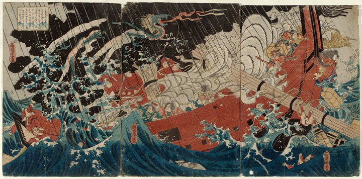 Myndin sem fylgir þættinum er eftir ukiyo-e tréskurðarmeistarann Utagawa Yoshitora og sýnir hina mjög dramatísku goðsögu þegar eiginkona Yamato Takeru, Tachibana, stekkur út í hafið til að friða storminn.