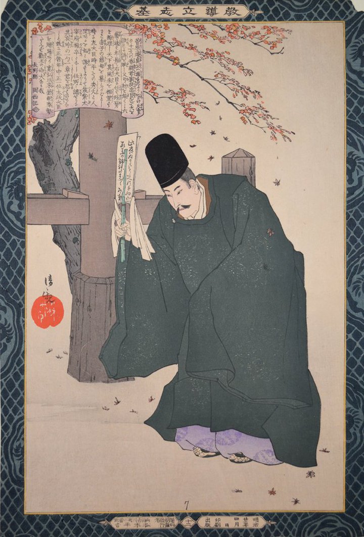 Myndin er eftir Kobayashi Kiyochika nítjándu aldar tréskurðarmeistara og sýnir embættismanninn Michizane ásamt ljóðum sínum.