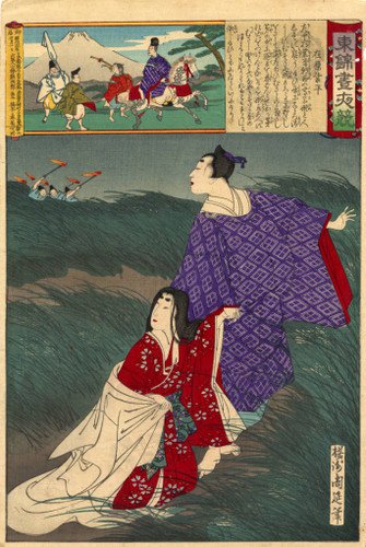 Myndin sem fylgir er eftir útskurðarmeistarann Chikanobu Yoshu og sýnir Narihira á flótta með ástkonu sinni undan sendimönnum Fujiwara-ættarinnar.