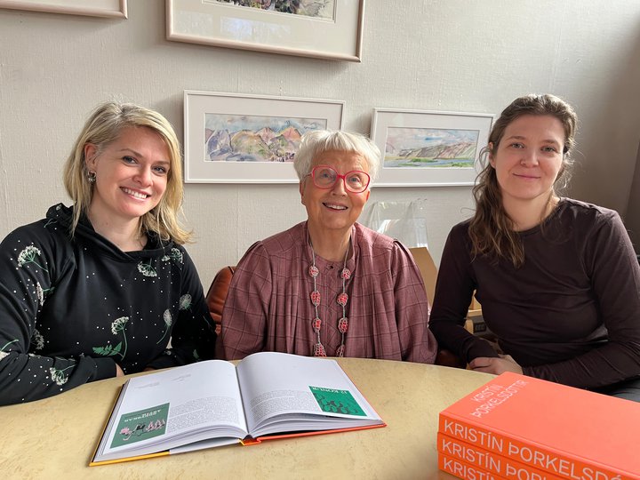 Á myndinni eru frá vinstri Bryndís Björgvinsdóttir, Kristín Þorkelsdóttir og Birna Geirfinnsdóttir, annar höfundur bókarinnar um Kristínu og hönnuður verksins.