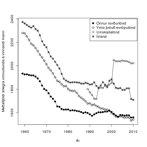 En hér má ekki láta glepjast, því þetta er hræðsluáróður: Markmiðið er fyrst og fremst að hræða þingmenn á Alþingi Íslendinga til að hunsa frumvarpið, en jafnframt koma þeirri hugmynd að í hugum fólks að skemmri vinnutími muni orsaka verðbólgu. Samtökin segja líka að vinnutími hafi styst á undanförnum fjórum áratugum. Af hverju fjórum áratugum? Ef litið er á meðfylgjandi mynd, þá sést að vinnutími á Íslandi styttist mjög mikið milli 1970 og 1980, en síðan þá hefur lítið breyst. Samtökin bæta að vísu við að vinnutími hafi almennt styst um fjórar stundir á viku, undanfarna tvo áratugi.