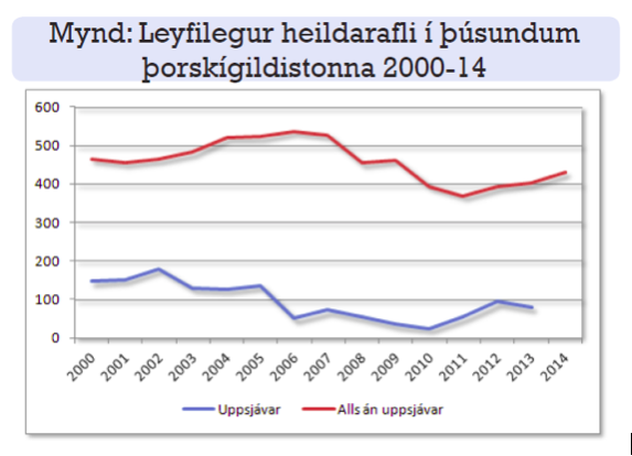 Á myndinni sést að nokkrar sveiflur hafa verið í heildaraflaheimildum í þorskígildistonnum talið. Staðalfrávik sem hlutfall af meðaltali af öllum tegundum nema uppsjávarfiski er um 12%. Í uppsjávarfiski (síld og loðnu) er staðalfrávik sem hlutfall af meðaltali miklu hærra eða um 51%. Af þessu má sjá að hlutfallið 5-10% (sem eru heimildirnar sem greiða þarf fyrir) er innan við þá sveiflu sem verið hefur. Áfram yrði öllum til góðs að auðlindin yxi og dafnaði.