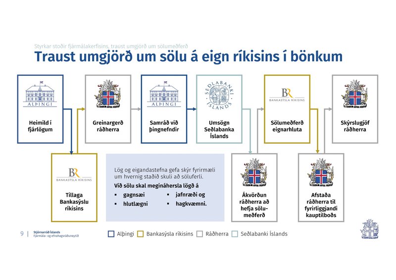 Lögin um sölu á eignarhlutum ríkisins í bönkunum sem samþykkt voru í desember 2012 áttu að skapa trausta umgjörð ef ætti að selja hlutina. Leiðarstef laganna eru gagnsæi, hlutlægni, jafnræði og hagkvæmni. Draga átti dýran lærdóm af bankahruninu.