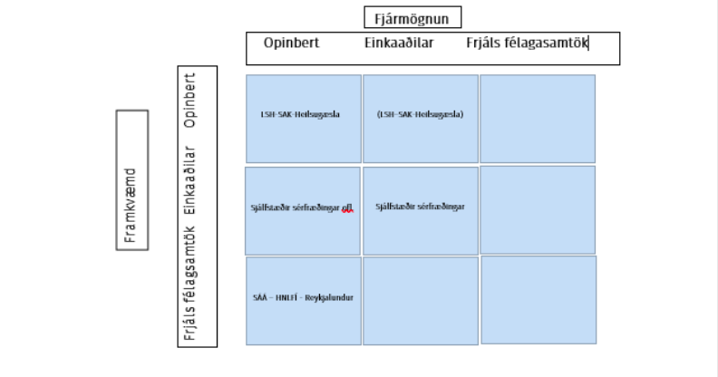 Ferhyrningur þjónustu og fjármögnunar (mynd 1.) er þekktur þegar kemur að því að meta hvar almannaþjónustu skuli komið fyrir. Hver á að veita þjónustuna og hver á að greiða fyrir hana? Þegar kemur að geðheilbrigðisþjónustunni er bráða- og sjúkrahúsþjónusta hennar öll innan opinbera kerfisins en lengri tíma- og viðhaldsmeðferð er skipt á milli opinbera- og einkakerfisins. Þegar kemur að endurhæfingu koma allir þrír hlutar kerfisins, hinn opinberi (e. public), einka (e. private) og borgaralegt samfélag (e. civil society), að framkvæmd þjónustunnar. Í nýrri geðheilbrigðisstefnu stjórnvalda þarf að endurspeglast hvernig framtíð og útfærslu við sjáum fyrir okkur þegar kemur að því hver á að veita þjónustuna og hver að greiða fyrir hana. Viljum við t.a.m. að frjáls félagasamtök veiti heilbrigðisþjónustu sem er fjármögnuð af almannafé? Hvaða hluta eiga sveitarfélögin að sjá af þjónustu hins opinbera? Geta þau tekið við auknum hluta af opinberri nærþjónustu? Nú er skipting opinberrar þjónustu á Íslandi 27% hjá sveitarfélögum og 73% hjá ríki á meðan meðaltal sömu skiptingar í Evrópuríkjum er nær 50/50.