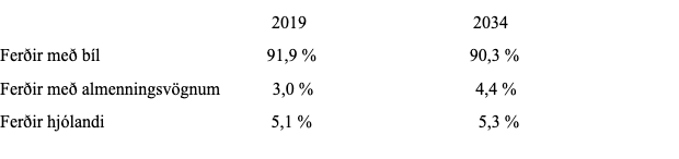 Skv. spánni minnkar hlutur ferða með bíl um 1,6 prósentustig á tímabilinu 2019 – 2034. Ferðir með almenningsvögnum aukast um 1,4 prósentustig og ferðir hjólandi um 0,2 prósentustig. Af þessu má ráða að ef almenningssamgöngur verða ekki bættar frá því sem er í dag myndi bílaumferð árið 2034 verða 1,4 prósentustigum meiri en ella. Það samsvarar = (1,4/90,3) x 100 = 1,6 % hlutfallslegri aukningu. M.ö.o., ef almenningssamgöngur verða ekki bættar frá því sem er í dag myndi bílaumferð árið 2034 verða 1,6 % meiri en ella. Aukning upp á 1,6 % á 15 ára tímabili jafngildir um 0,1 % aukningu á ári. Ef við framreiknum til ársins 2040 myndi niðurstaðan verða um 2 %, sem er svo sannarlega í samræmi við fyrrgreint mat mitt um að Borgarlínan muni í besta falli leiða til þess að bílaumferð árið 2040 verði 4 – 5 % minni en ella (sjá fyrrgreinda grein í Kjarnanum 17.03.2019).