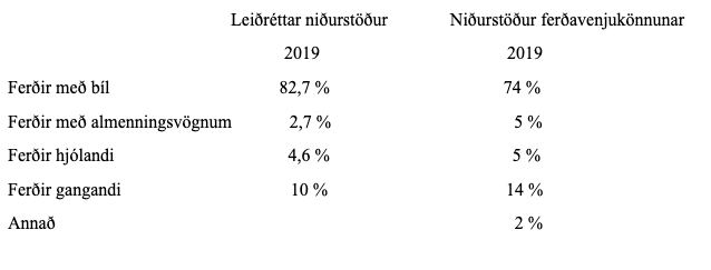 Eins og áður hefur verið greint frá eru ferðir gangandi ekki með í nýja samgöngulíkaninu. Ef við gefum okkur að ferðir gangandi séu 10 % af öllum ferðum árið 2019 þá lækkar hlutdeild hinna ferðamátanna. Við skulum jafnframt bera leiðréttar niðurstöður saman við niðurstöður ferðavenjukönnunar á höfuðborgarsvæðinu 2019: