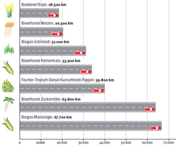 Hér að ofan má sjá vel heppnaða skýringarmynd: Hversu langt kemstu á afurð 1 hektara lands, miðað við mismunandi framleiðsluaðferðir en alltaf sama bíl. Myndin er úr ranni Austurríska landbúnaðar- og umhverfisráðuneytisins (Bundesministerium für Land- und Forstwirtschaft, Umwelt und Wasserwirtschaft) , sótt 2008.