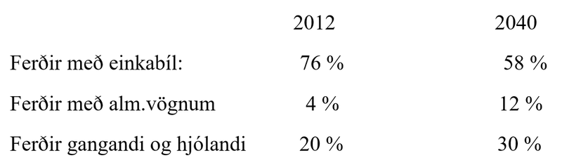 Eins og kunnugt er voru sett eftirfarandi markmið í svæðisskipulagi höfuðborgarsvæðisins 2015 – 2040 um breyttar ferðavenjur: