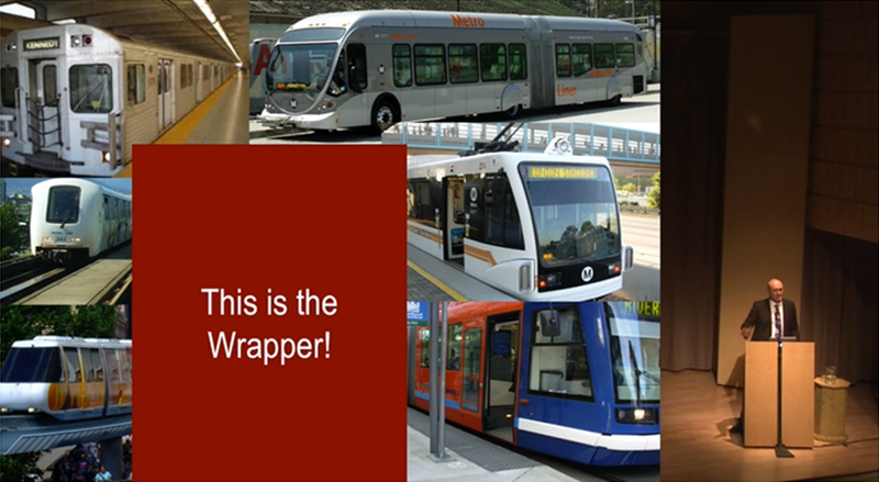 Áhugaverðasti hlutinn af fyrirlestrinum eru síðustu 6 mínúturnar, þ.e. milli 46. og 52. mín, þar sem hann segir m.a. „Public Transport is not about infrastructure“. Almenningssamgöngur snúast ekki um innviði. Aðalmálið er bætt aðgengi, þar sem aukin ferðatíðni skiptir mestu máli. JW líkir bættu aðgengi við mat og tæknilegri útfærslu innviða (technology) líkir hann við umbúðir utan um matinn. Umbúðirnar eru aukaatriði. Ef menn einblína svo mikið á tæknilega útfærslu innviða að það leiði til þess að hagkvæmasta almenningssamgöngukerfið verði ekki fyrir valinu, þá séu menn að borða umbúðirnar en fleygja matnum. Hér er skjámynd í fyrirlestrinum sem lýsir vel hvað hann á við með umbúðum um matinn (wrapper).