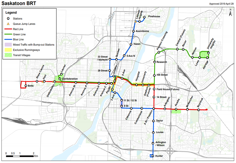 Í Saskatoon í Kanada (íbúafjöldi svæðis rúmlega 300.000) er fyrirhugað að byggja 38 km BRT-kerfi á næstu árum. Einungis 3,5 km, eða um 10% af kerfinu, verður með sérrými. Skilgreining á BRT er mismunandi eftir löndum og stofnunum og hraðvagnaleið með sérrými á litlum hluta leiðarinnar er stundum kölluð BRT-Lite. Hér má sjá kort yfir leiðarnar: