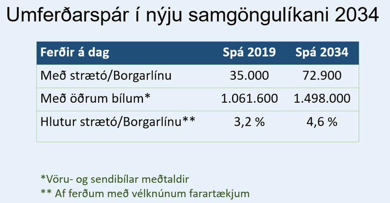 Þarna sjáum við að hlutur ferða með almenningsvögnum af öllum ferðum með vélknúnum ökutækjum eykst aðeins úr 3,2 % árið 2019 upp í 4,6% árið 2034 skv. umferðarspánni.