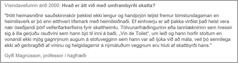 Allt að helmingur þjóðartekna tæknivæddra nútímasamfélaga rennur til opinberra málefna – í formi opinberra álaga. Tæknivæddasti hlutinn, sá er veldur þó mestu um þá framleiðni sem öll skattlagning er beint og óbeint reist á, ber engu að síður lægsta skatta og lægstu gjöld. Þeim mun hlutfallslega færri hendur sem koma að tæknivæddri framleiðslu og þjónustu, þar sem framleiðni eðlilega mest nýtur, því lægri eru álögurnar, slík er almennt ofuráherslan á einstaklingsbundna tekjuskatta og launatengd tryggingagjöld af ýmsu tagi. Rekstrartekjuskattar koma svo þeim mun síður til álita sem ágóða af mjög tæknivæddum rekstri er varið til enn öflugri og framleiðnivæddari rekstrar – og hvort þá ekki dregur enn frekar úr vægi hinna einstaklingsbundnu tekjuskatta og tryggingagjalda af tæknirekstrinum.
