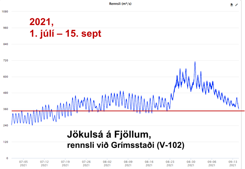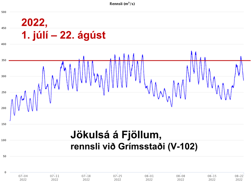 Athyglisvert er að bera saman mjög mikið rennsli í Jökulsá á Fjöllum í fyrrasumar 2021 við yfirstandandi sumar. Sá samanburður er nánast eins og svart og hvítt. Ef við skilgreinum 350 m3/s sem nokkuð venjulegt sumarrennsli og drögum þá línu inn á línuritin fyrir rennslismælingarnar, sjáum við hve gríðar miklu munar. Í fyrrasumar má segja að þetta skilgreinda sumarrennsli hafi staðið samfellt frá því um 16.- 17. júlí til og með 15. september. Mest var það um 700 m3/s, 31. ágúst. Einkar tilkomumikið hefur verið að standa við Dettifoss þann dag!