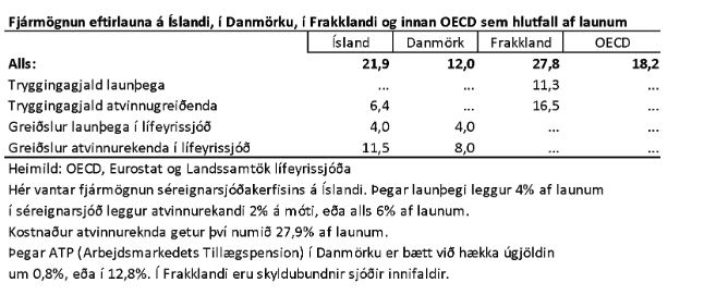 Kostnaður atvinnurekenda kemur enn betur í ljós þegar fjármögnun eftirlaunakerfisins er skoðuð sem hlutfall af launum. Í Danmörku nemur hlutfall launatengdra gjalda vegna eftirlauna 12,8% af launum, í Frakklandi 27,8%. Á Íslandi getur kostnaðurinn við kerfið numið allt að 27,9% af brúttólaunum þeirra tekjuhæstu, þegar 6% séreigninni hefur verið bætt við. Ástandið á Íslandi er því ekki síður alvarlegt en í Frakklandi og það eina sem skilur á milli er að Íslendingar eru hlutfallslega yngri en Frakkar.