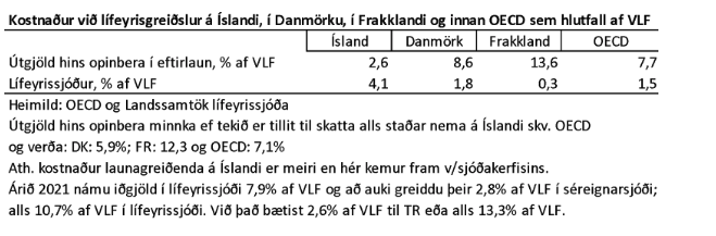 Þá er það kostnaðurinn. Í Frakklandi kostar eftirlaunakerfið 13,9% af vergri landsframleiðslu ár hvert. Í Danmörku kostar það hins vegar 9,8% af VLF, þegar útgreiðslum lífeyrissjóða hefur verið bætt við og 6,7% á Íslandi.