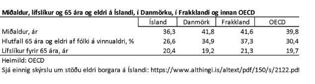 Miðaldur Íslendinga er 36,3 ár, þ.e. fimm árum lægri miðaldur en í Danmörku og í Frakklandi. Hlutfall þjóðarinnar sem er 65 ára og eldri af vinnualdri er 26,6% á m.v. 34,9% í Danmörku og 37,3% í Frakklandi. Í Frakklandi er samt stefnt að eftirlaunaaldur verði 65 ár, þ.e. tveimur árum lægri en tíðkast nú þegar á Íslandi, og lífslíkur Íslendinga, Dana og Frakka 65 ára og eldri er svo til þær sömu, eða 20,4 ár fyrir Íslendinga, 19,2 fyrir Dani og 21,3 fyrir Frakka