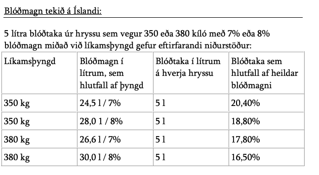 Eftir þessu að dæma nemur áætlað blóðmagn hjá íslenskri stóðhryssu sem er af norrænu hestakyni (óþjálfuð í venjulegu fóðurástandi) 7% af líkamsþyngdinni.