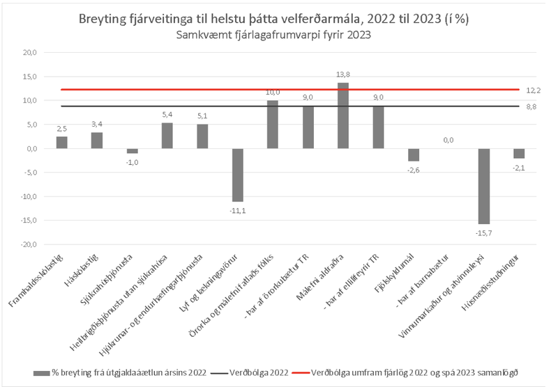 Í fjárlögum ársins 2022 var gert ráð fyrir 3,3% verðbólgu, sem síðan hefur reynst verða miklu meiri (a.m.k. 8,8%). Rauða línan á myndinni sýnir verðbólgu ársins í ár umfram forsendur fjárlaga (5,5%), að viðbættri spá fyrir næsta ár (6,7%), alls 12,2%. Súlurnar sýna breytingu fjárveitinga í frumvarpinu frá áætlaðri útkomu ársins í ár til einstakra liða velferðarmála (sem er í flestum tilvikum svipuð og breytingin frá síðustu fjárlögum). Þessi samanburður útgjalda og verðbólgu gefur vísbendingu um hvort verðbólga ársins í ár sé bætt að fullu eða ekki. Síðan bætast við áhrif af verðbólgu næsta árs (rauða línan). Samanburður útgjalda til einstakra liða við rauðu línuna sýnir líkur á rýrnun útgjalda vegna verðbólgu áranna 2022 og 2023.