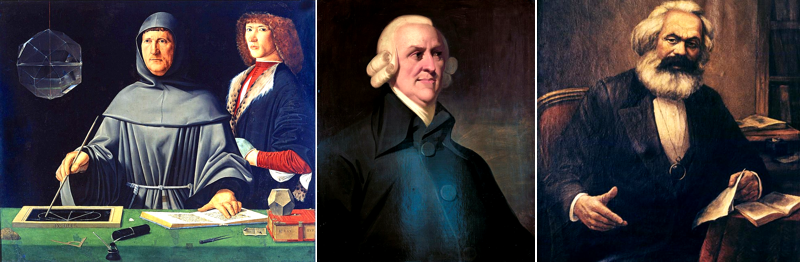 Að væntri forskrift Pacioli er orku- og auðlindadrifnu skattkerfi hér lýst með sem einföldustum hætti. Smith væri mögulega nokkuð sáttur við markmið þess, væri hann uppi nú á dögum, svo algjört eitur í beinum hans sem þau voru, gömlu bræðralagsgildin, og hvort þá ekki væru það, einokunarhringirnir nú á dögum, öll þau systra- og bræðralögin, svo vel sem velferðarríkið kynni líka að falla að kenningu hans um siðferðiskenndirnar. Ef Marx hefði lifað allar byltingar sínar, væri hann vafalaust heldur farinn að mildast, karlinn, jafnvel svo að hann sæti þá á rökstólum með Smith gamla, þeir mögulega að bollaleggja með Pacioli hver skyldi nú vera einfaldasta framsetningin…