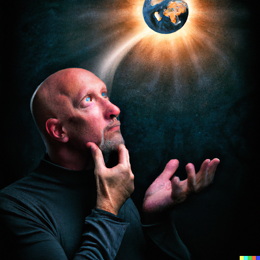 Mörg okkar létu appið Lensa gera af okkur ofurhetjumyndir undir lok síðasta árs og hér er mynd sem DALL-E 2 módel fyrirtækisins Open AI skilaði þegar ég bað það um að sýna mér miðaldamálverk af sköllóttum íslenskum manni að spá fyrir um framtíðina: