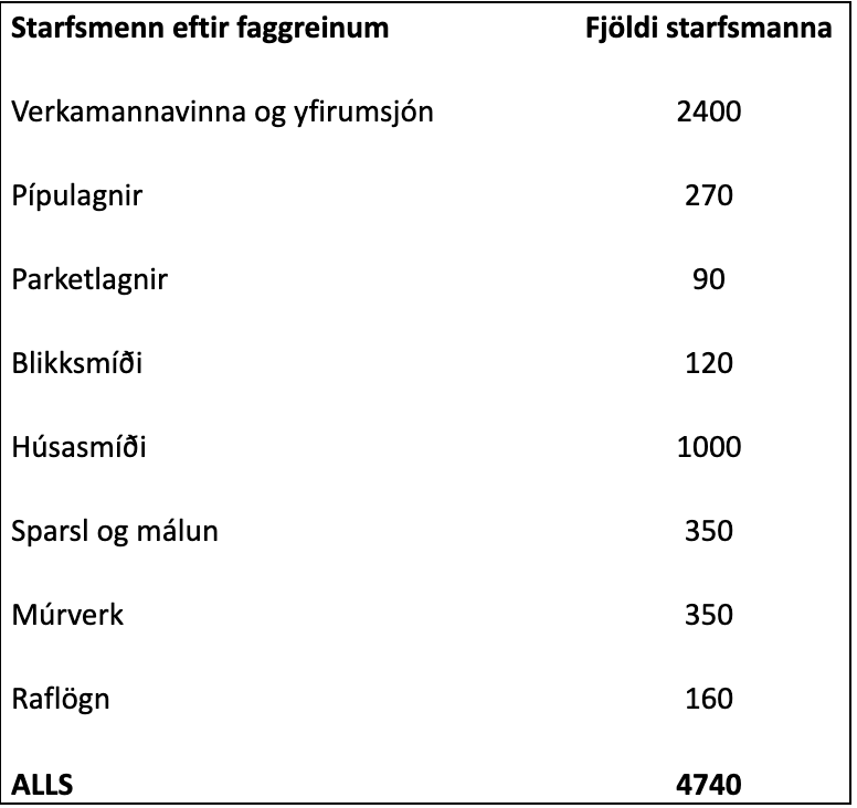 Það þarf því allt að 5000 verkamenn og iðnaðarmenn til að byggja 3000 íbúðir árlega. Þá eru eftir þeir sem sinna öðrum verkefnum: