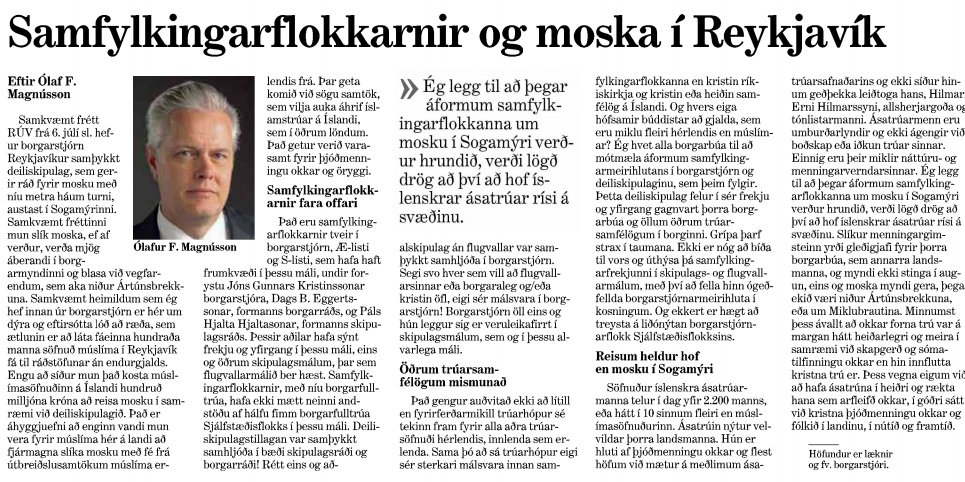 Í niðurstöðukafla greinargerðarinnar kemur þó fram að eitt bersýnilegasta dæmið sem hópurinn fann um menningarlegan rasisma hafi verið í grein eftir Ólaf F. Magnússon, fyrrum borgarstjóra í Reykjavík , sem birtist í Morgunblaðinu júlí 2013. Ólafur sagði þar að erlend „útbreiðslusamtök múslíma“ gætu komið við sögu þegar fjármagna þyrfti uppbyggingu moskunnar. Hann taldi að slík samtök myndu vilja „auka áhrif íslamstrúar á Íslandi, sem og í öðrum löndum“. Ólafur sagði að þetta gæti orðið varasamt fyrir „þjóðmenningu okkar og öryggi“. Að hans mati ættu ásatrúarmenn frekar að reisa hof í Sogamýrinni en múslimar þar sem ásatrú njóti velvildar þorra landsmanna og sé „hluti af okkar þjóðmenningu“.