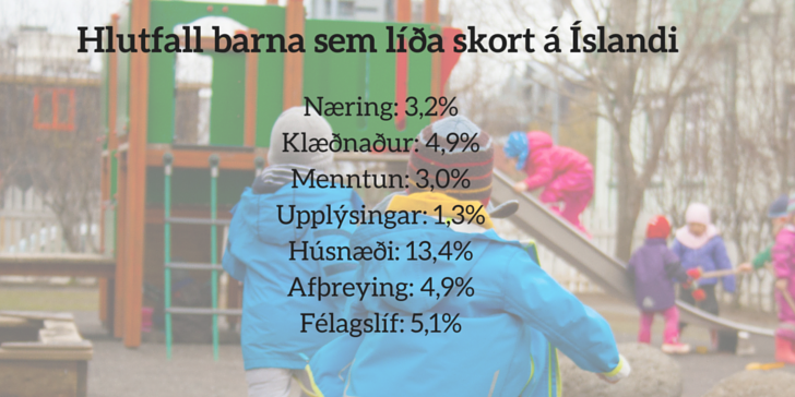 Árið 2009 skorti 77,1% barna á Íslandi ekki neitt, en árið 2014 hafði sú tala lækkað niður í 60,6%. Þegar skoðað er hversu mikið börn á Íslandi skortir kemur í ljós að dæmi eru um að börn hér á landi líði skort í öllum sjö flokkunum sem spurt er um. Það eru 0,2% barna, eða sem samsvarar 147 börnum.