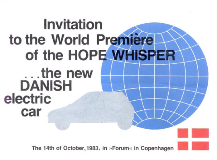 Nýi rafbíllinn, Hope Whisper, var auglýstur sem aðalnúmer sýningarinnar. Fyrsti rafbíll sem framleiddur hafði verið, danskur! Á annað þúsund gesta og rúmlega eitt hundrað fréttamenn voru mættir til að fylgjast með. Sýningin var opnuð kl. 10.30, Thure Barsøe flutti ávarp og það gerði líka Poul Schluter forsætisráðherra Danmerkur og ýmsir fleiri. Hope Whisper stóð efst í einskonar rennibraut, hulinn dökkri ábreiðu, með sérstaka stoppklossa við framhjólin. Undir stýri sat verkstæðisformaðurinn Claus Fjeldgaard en þegar bíllinn hefði runnið niður af pallinum átti hann að aka nokkra hringi. Loks var ræðuhöldunum lokið, stoppklossunum kippt burtu og ábreiðunni svipt af.