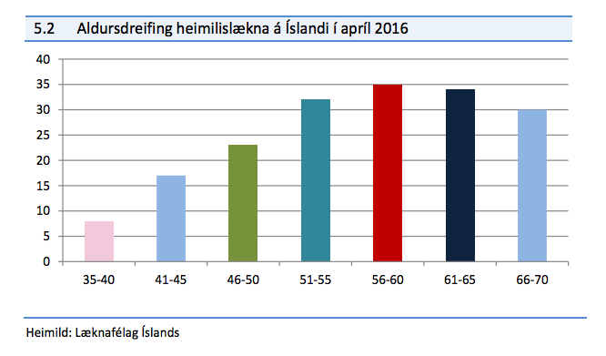 Aðeins 25 heimilislæknar á Íslandi eru á aldrinum 35 til 45 ára, samanborið við 64 heimilislækna á aldrinum 61 til 70 ára. Þegar farið er í minni aldursbil, til dæmis 35 til 40 ára, eru aðeins átta heimilislæknar á Íslandi á þeim aldri. 30 heimilislæknar eru á aldrinum 66 til 70 ára.