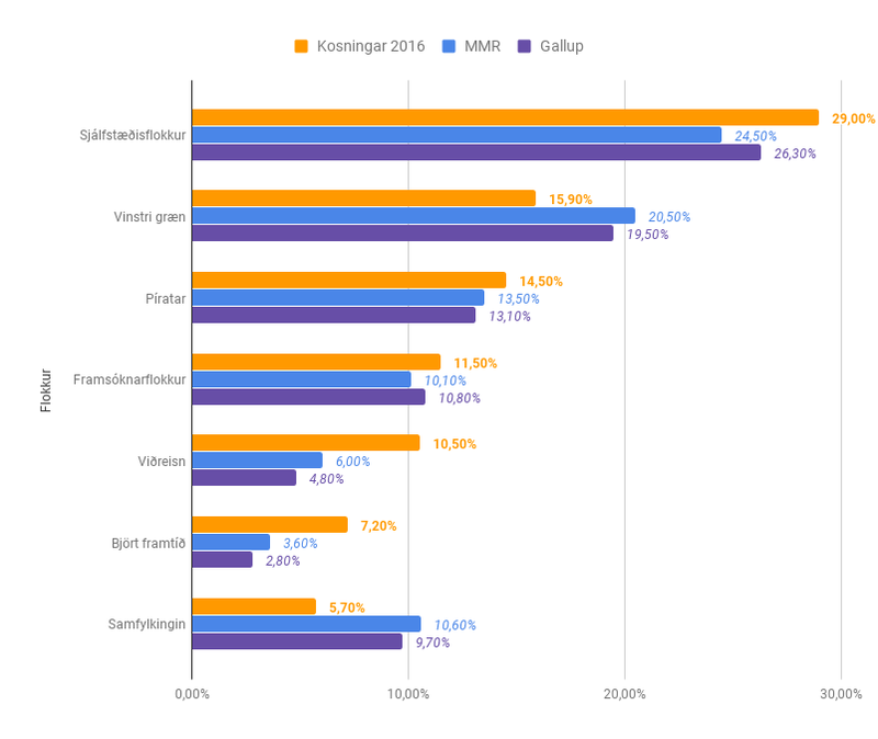 | Flokkur | Kosningar 2016 | MMR | Gallup |