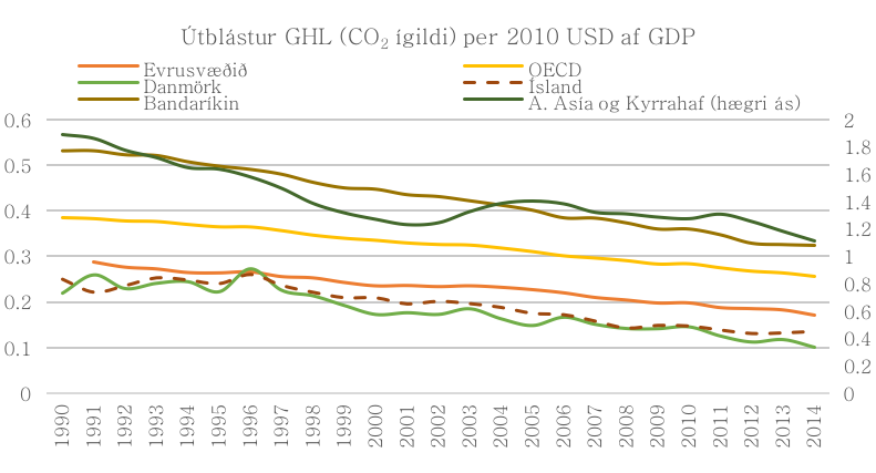 En hvað er kolefnisfótspor Íslendinga? Losunarbókhald Íslands fyrir bæði Kyoto-bókunina og Parísarsáttmálann miðast aðallega við framleiðslu og er mælt út frá losun sem á sér stað innan landamæra og lögsögu Íslands. Þó svo að við náum að öllum líkindum ekki að standast Kyoto-bókunina fyrir árið 2020 hefur losun gróðurhúsalofttegunda á framleidda einingu (2010 USD af GDP) þó minnkað um 50% á tæpum 30 árum sé litið á tölur frá Alþjóðabankanum (4). Íslendingar standa sig því vel þegar litið er til þessa, og þó víða væri leitað (Danir standa sig þó betur). En Bandaríkjamenn, lönd á Evrusvæðinu og OECD ríkin losa allt að tvöfalt meira magn af gróðurhúsalofttegundum við hverja framleidda einingu heldur en Ísland. Sé litið á mynd 1 má sjá þessa þróun frá árinu 1990 (4).