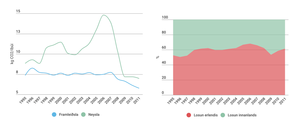 Það er áhugavert að bera saman kolefnisspor Íslendinga út frá framleiðslu landsins annars vegar og svo neyslu hins vegar yfir tímabil. Þá sést mjög vel hvernig efnahagsleg skilyrði í landinu hafa áhrif á kolefnissporið okkar. Til að mynda jókst kolefnisspor með tilliti til neyslu á árunum fyrir efnahagshrunið árið 2008 og dróst svo saman enn hraðar á hrunsárunum. Með því að nota tölur frá OECD er einnig hægt að finna hversu mikið af losun gróðurhúsalofttegunda vegna neyslu Íslendinga er innanlands og hversu mikil losunin er erlendis. Frá árunum 1995–2011 var losun erlendis vegna framleiðslu á vörum fyrir neyslu Íslendinga um það bil 60%.