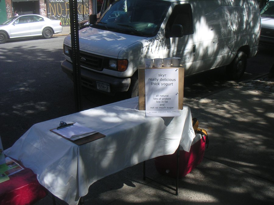 Það leit nú ekki út fyrir að mikið veldi væri í uppsiglingu þegar hann var að kynna vöruna í upphafi. Lítið borð með skilti á markaði í New York, þar sem skyrið var boðið til sölu, eftir tilraunastarfsemi í eldhúsinu. Góð viðbrögð gesta á markaðnum gáfu von um að tækifærið væri fyrir hendi.